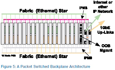 圖6的設(shè)置表明,在一個集成的分組交換底板解決方案中,這種最開始基于幾種不同機(jī)箱而開發(fā)的解決方案可能看起來象什么。建立在CompactPCI