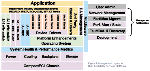 圖8展示了管理層的外觀,它兼容PICMG 2.16的CompactPCI平臺。在較低的水平上,系統(tǒng)的健康和性能度量標準通過平臺的可替換單元(FRUs)和中間設(shè)備之間互相通信的平臺性能提升得以實現(xiàn)。HA管理軟件層提供健康和性能方面的度量標準和最高層管理應用之間的通信。