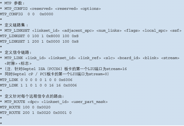 system.txt文件必須也包括主機上運行的所有本地SS7協(xié)議,如ISUP、TUP、SCCP或TCAP(如果有),以及應用程序任務、配置工具(如s7_mgt)和調(diào)試工具的LOCAL定義。這里也應該通過FORK_PROCESS語句來啟動相應的驅動和支持任務,在相應的程序員手冊中有詳細描述。