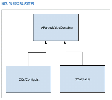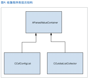 AparsedValueContainer類沒有數(shù)據(jù)和方法。它僅用于配合收集程序類的運行。(見圖3。)抽象收集程序類純虛擬功能CollectValues()的第二個影響因素是容器,當在具體收集程序類實施中定義了容器時,必須使用通用的基礎類。所以在真正使用容器之前,必須在每個具體的收集程序類中進行向下類型轉(zhuǎn)換。