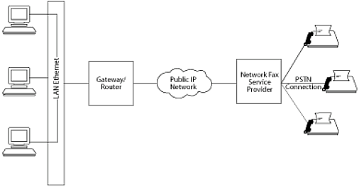 目前,許多的Internet傳真服務(wù)僅能提供存儲(chǔ)轉(zhuǎn)發(fā)傳真,這種服務(wù)在用戶電腦終端和世界其他地方的傳真網(wǎng)關(guān)連接在一起。這是一種傳統(tǒng)LAN傳真技術(shù)的擴(kuò)展,客戶端的傳真網(wǎng)關(guān)允許客戶端PC或者工作站創(chuàng)建文檔并通過一個(gè)通用網(wǎng)關(guān)發(fā)送傳真。