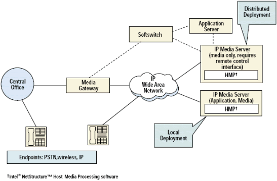 一個(gè)IP媒體服務(wù)器是在網(wǎng)絡(luò)中的終結(jié)IP連接的節(jié)點(diǎn). 根據(jù)客戶環(huán)境的不同(服務(wù)提供商或企業(yè)), IP媒體服務(wù)器可以用很多方法來實(shí)現(xiàn).