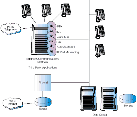 圖1描述了當前一個典型的復雜的企業(yè)通信系統(tǒng)配置。連接到PSTN的主要部分PBX/KTS,仍然是系統(tǒng)的核心,提供了交換和自動呼叫分配的功能。一系列增加的應用通過附屬服務器連接到PBX/KTS上。很多附屬服務器也連到數(shù)據(jù)中心上,因為它們需要訪問企業(yè)的數(shù)據(jù)。 使現(xiàn)有情況變得更為復雜的是,Internet正在變?yōu)椴豢扇鄙俚纳虅展ぞ,各公司紛紛安裝VoIP以降低網絡成本,滿足多媒體通信的需要。這些服務由企業(yè)防火墻后的網關提供,這個網關也是連接到PBX/KTS上的。