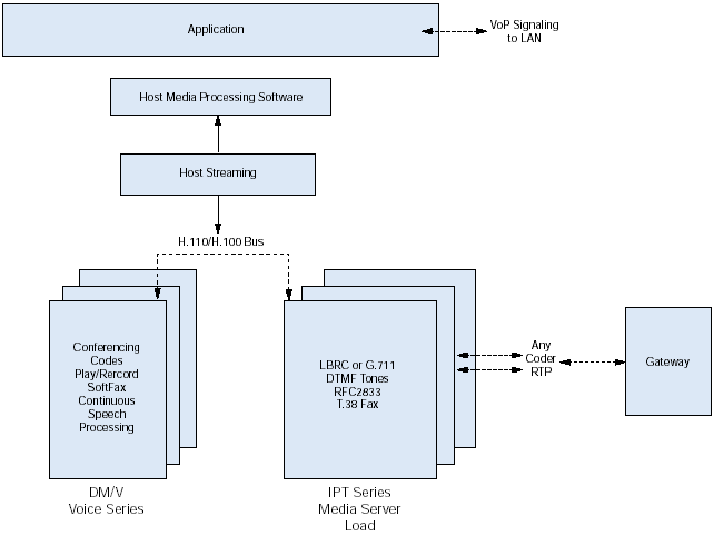 如圖2所示,IPT系列板卡可以通過H.110總線連接到任何一個(gè)高密度的Dialogic Dialogic DM/V語音系列媒體處理板卡上。開發(fā)商通過組合IPT系列和DM/V板卡,便可以分發(fā)他們的解決方案,包括語音處理、傳真、講話以及會議功能,這套解決方案可以使每個(gè)系統(tǒng)可以從數(shù)以百計(jì)的端口升級到數(shù)以千計(jì)的端口。開發(fā)商也可以選擇使用IPT系列板卡作為高密度接口板卡,并連接到PCI總線使其可以訪問在主機(jī)處理器上執(zhí)行的媒體處理功能。