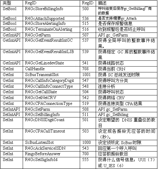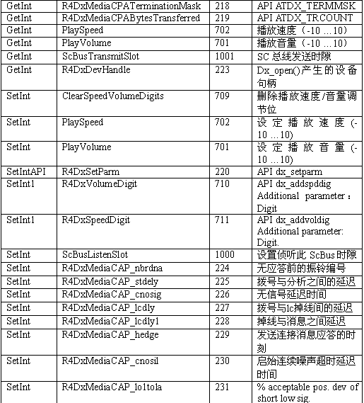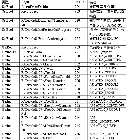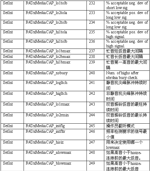 必須注意,調(diào)用API級的函數(shù)設(shè)置一個(gè)CTADE_A參數(shù)可能不只改變電路板級的參數(shù)。例如,R4DxMedia中,使用函數(shù)MediaSetBool設(shè)置REGID_R4DxMediaDisableAllToneDetection(280)為0或1來清除Dialogic提示音ID。