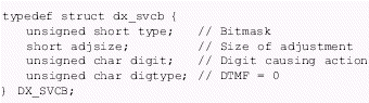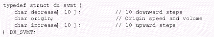。。速度/音量調(diào)節(jié)表(DX_SVMT)數(shù)據(jù)結(jié)構(gòu)有21個(gè)代表不同級別的速度和音量的條目,用于指定信道的速度或者音量調(diào)節(jié)的變化率。這些值可以設(shè)置或者用dx_setsvmt()和dx_getsvmt()從表中取值。