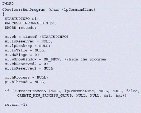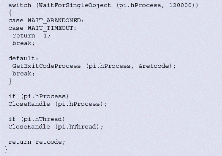 圖7中的函數(shù)RunProgram()顯示了一種產(chǎn)生Windows進程,然后等待該進程執(zhí)行完成的方式。