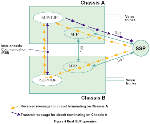 一個雙ISUP/TUP系統(tǒng)通過激活每個機箱中的一半電路協議狀態(tài)機進行工作。每個ISUP/TUP層通過本地MTP3發(fā)送所有的傳送業(yè)務。本地MTP3采用與相鄰SS7節(jié)點之間的本地鏈路進行傳輸,如果該鏈路發(fā)生故障,采用機箱之間的SS7連接。