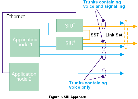 SIU通過從媒介處理中使用以太網分離SS7接口來處理容錯的問題,兩個SIU作為一個節(jié)點編碼進行容錯,如圖5所示,通過分離SS7接口,SIU也允許系統(tǒng)最多可以由32個處理語音電路(媒介)的應用節(jié)點組成。