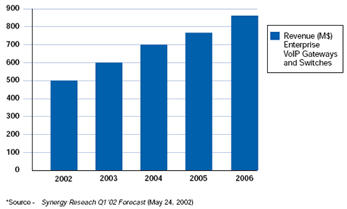 然后, Synergy也預(yù)測VoIP網(wǎng)關(guān)和交換應(yīng)用從2002年到2006年每年會(huì)有34.6%的增長. 需要產(chǎn)品來把傳統(tǒng)電話交換網(wǎng)絡(luò)和IP網(wǎng)絡(luò)橋接起來.