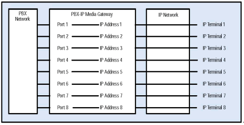 每一個(gè)PBX-IP 媒體網(wǎng)關(guān)的 PBX 端口都被設(shè)定了一個(gè)相應(yīng)的IP地址, 從PBX某個(gè)端口來的PBX網(wǎng)絡(luò)中的呼叫通過IP網(wǎng)絡(luò)被路由到制定的IP地址.