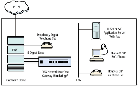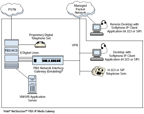PBX-IP 媒體網(wǎng)關(guān)可以把IP電話連接到傳統(tǒng)PBX上, 給PBX集成了網(wǎng)絡(luò)應(yīng)用, 擴(kuò)展了PBX, 集成了企業(yè)局域網(wǎng)或廣域網(wǎng)語音,